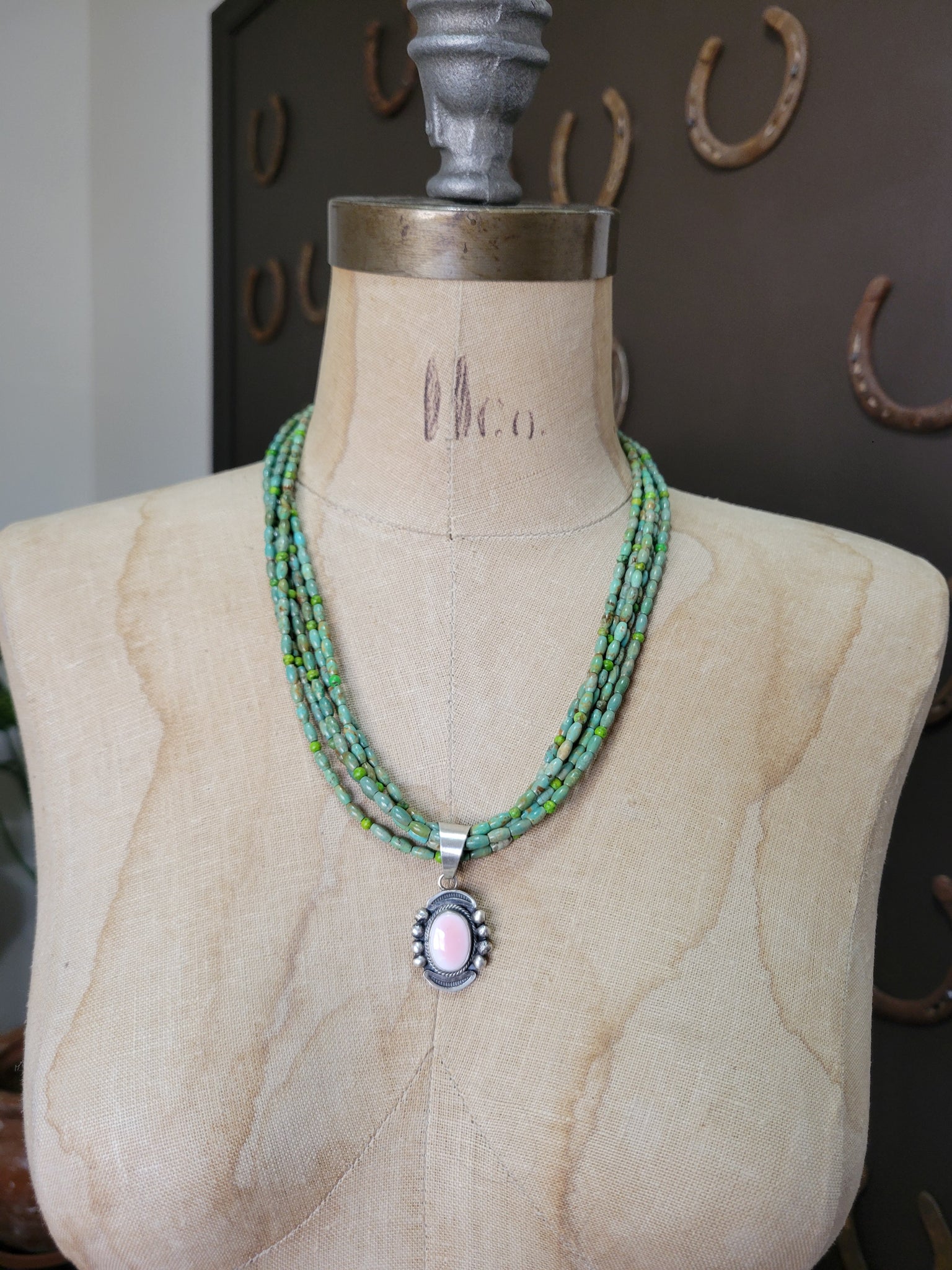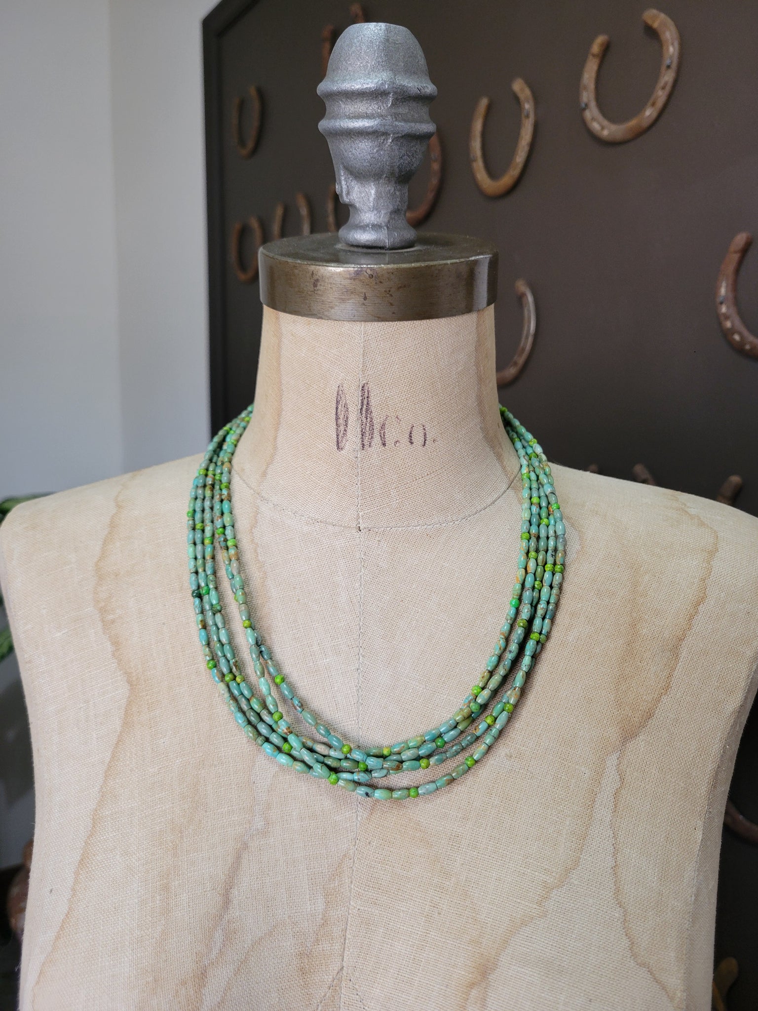 Five strands of gorgeous turquoise dance together in this playful necklace, finished with sterling silver pearls and clasp. Wear it bare and bold or dress it up with a pendant. This Native American handmade treasure adapts to your vibe. Pure dainty perfection.
