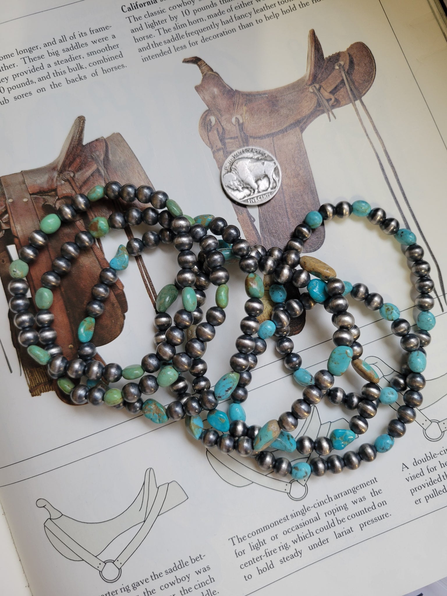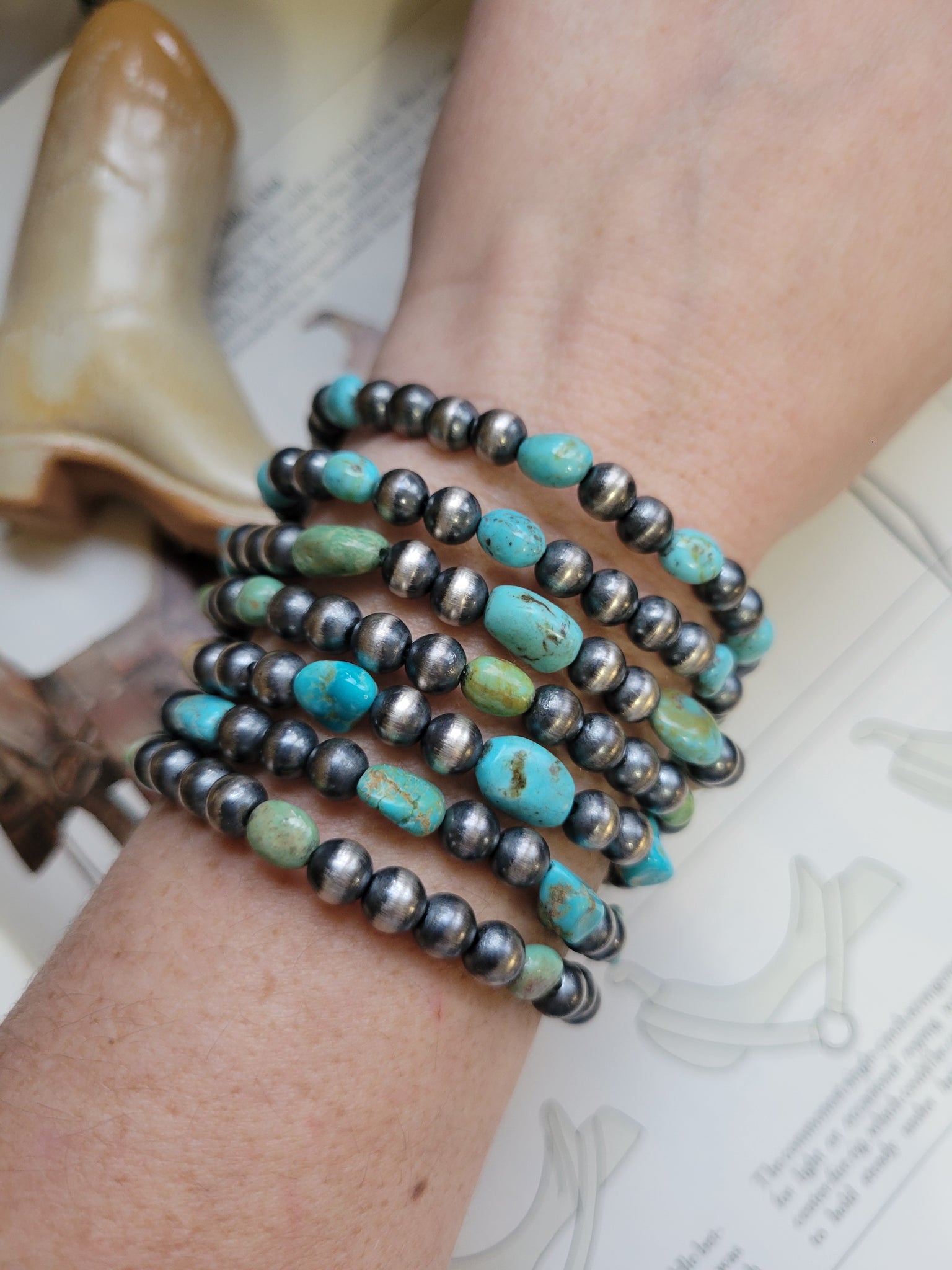 • Styles: Stretchy Silver Pearl Bracelet with Kingman Turquoise Nuggets