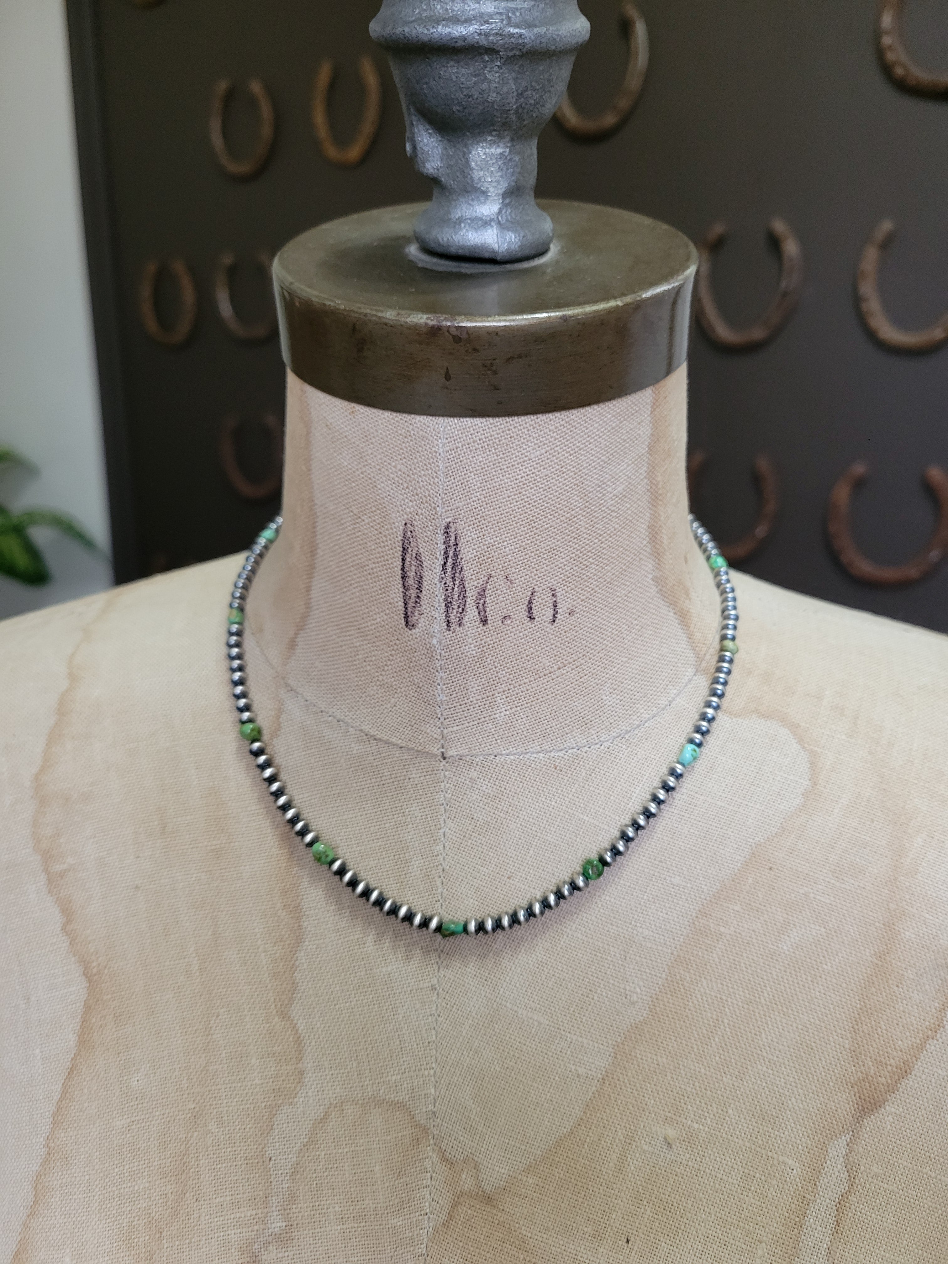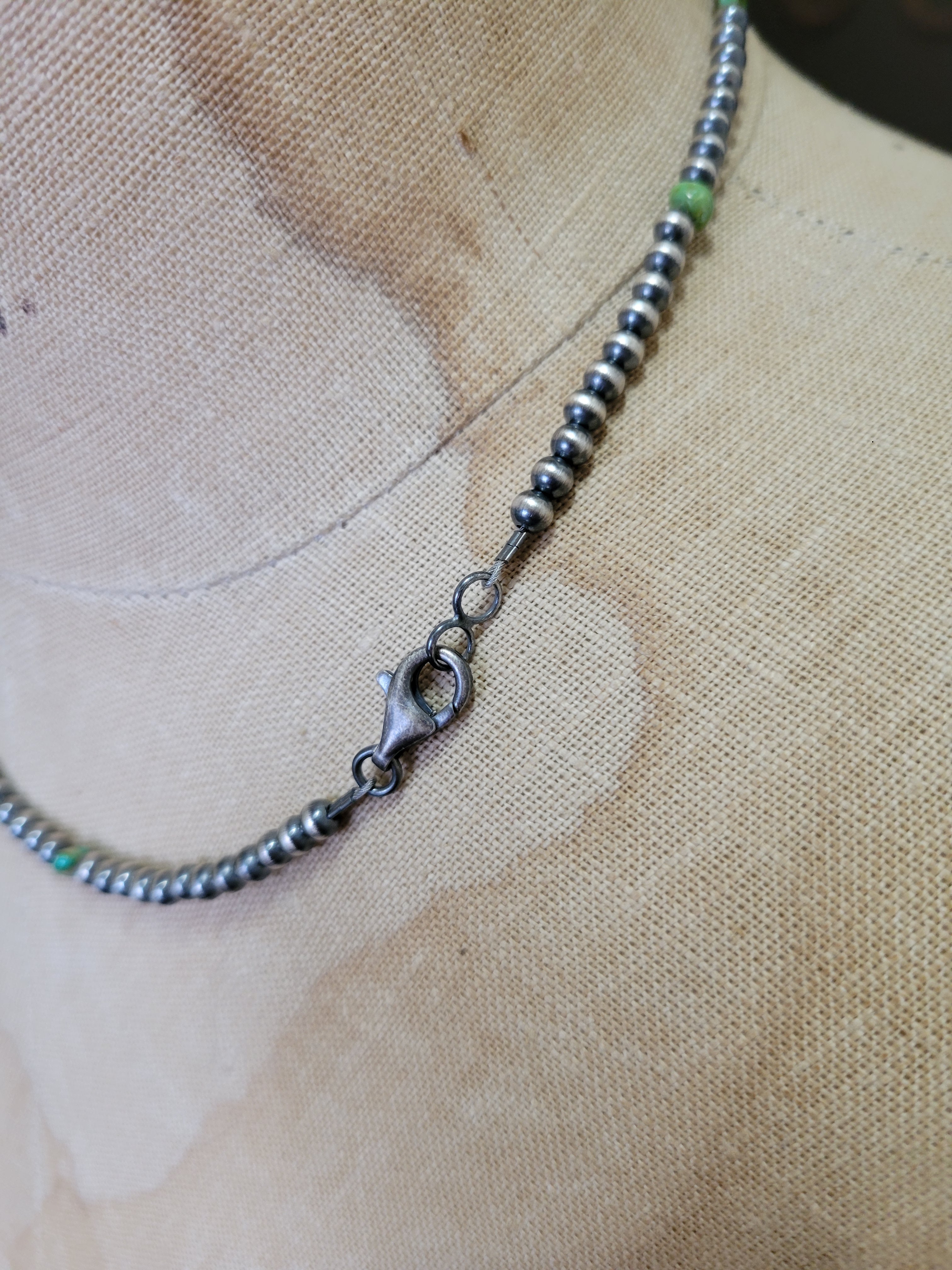 Hand-strung sterling silver pearls measuring 4mm, paired with authentic Sonoran turquoise beads in a versatile 17.5" to 18" strand. Each piece is individually crafted, resulting in natural variations in length of approximately ¼ to ½ inch. Custom extenders are available to achieve your desired fit. A refined choice for those who appreciate genuine gemstone jewelry with artisanal character.