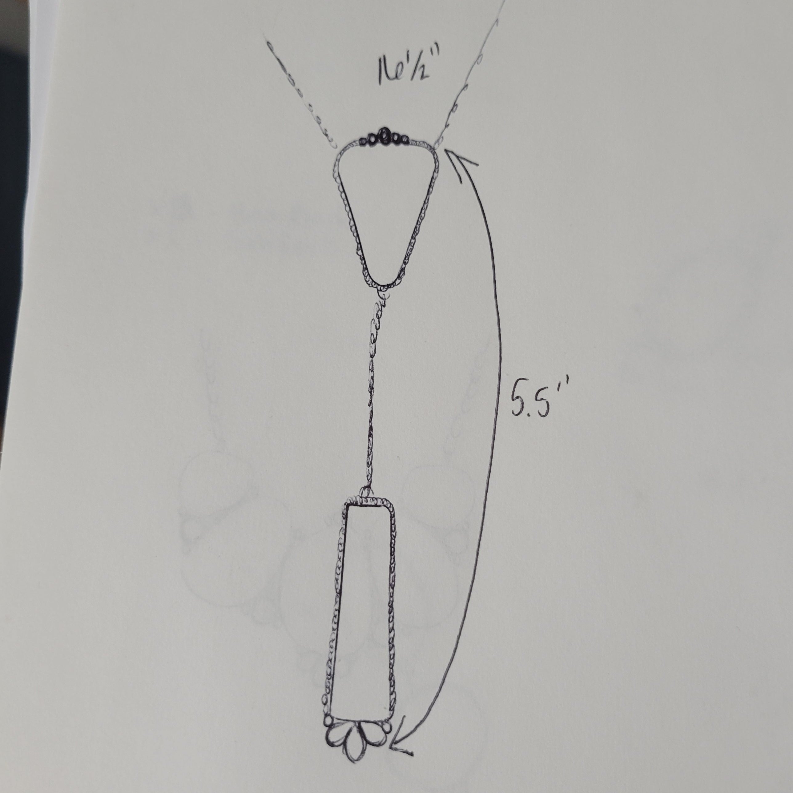 Details: 16.5" around neck, 5.5" drop, (view pics for correct measurements). Add 2" extender. Chain Style - argen., Small lobster clasp, 1/4 serated bezel. Bar- wide end at bottom. Triangle pointed down.