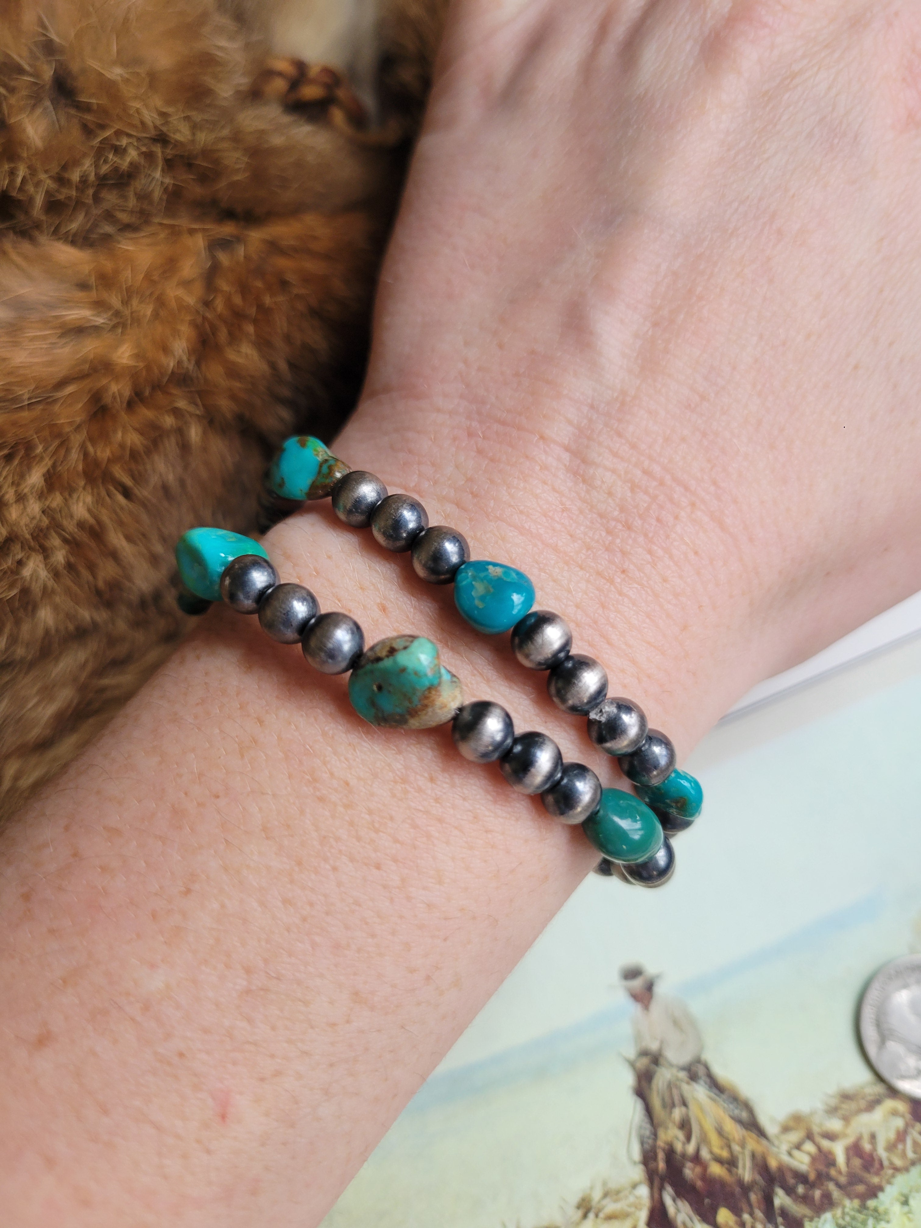 - Styles: Stretchy Silver Pearl Bracelet with Royston Turquoise Nuggets