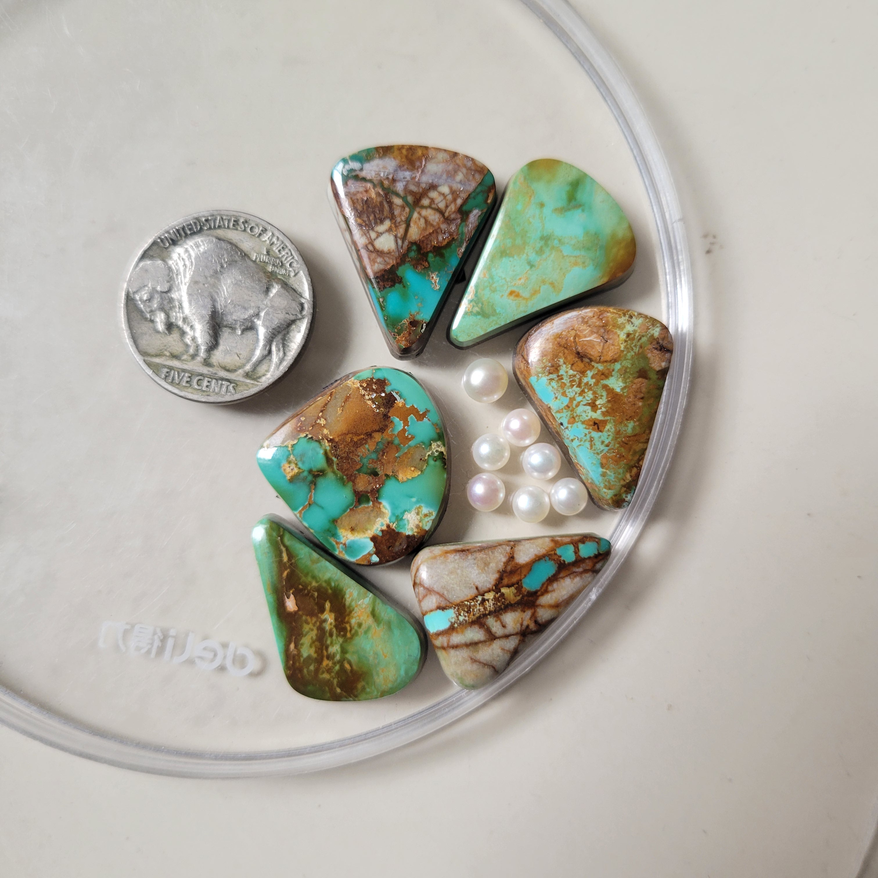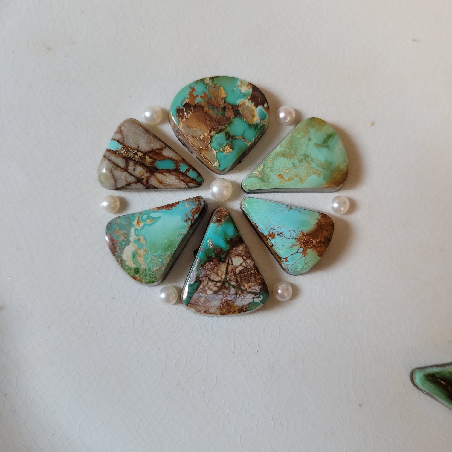 Pilot Mountain & Royston Turquoise set alongside fresh water pearls, in Sterling Silver