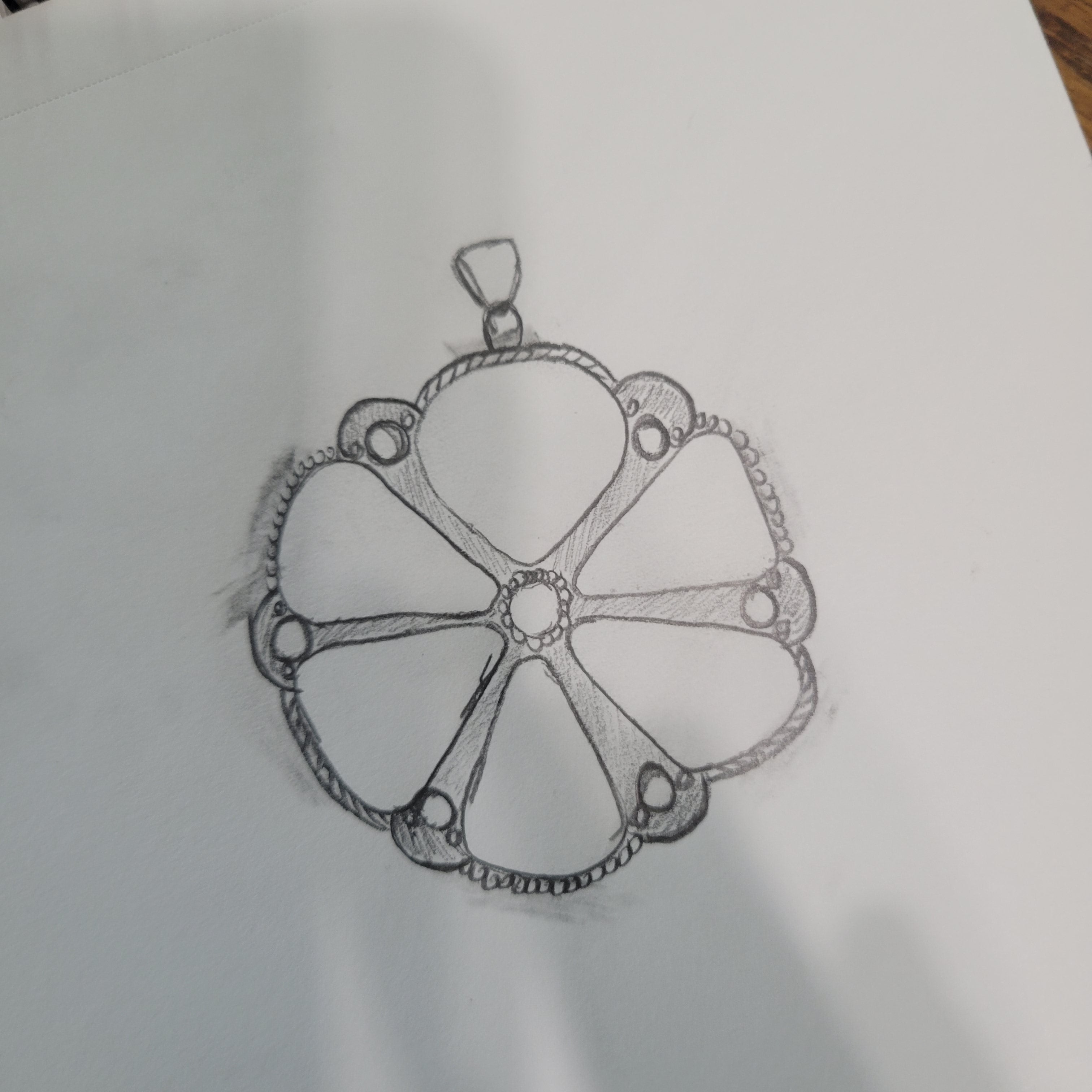 Build Details: 4-6mm bale, 1/8 ser bez, alternating bead and rope trim along each "petal" edge. Round wire around pearls.