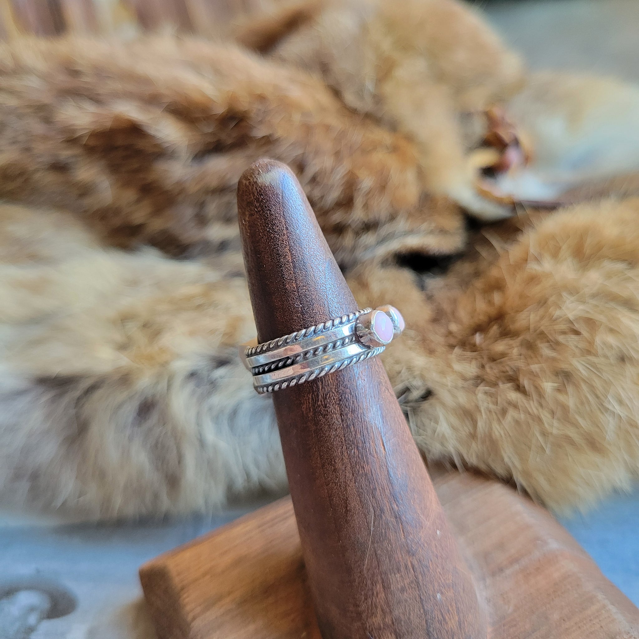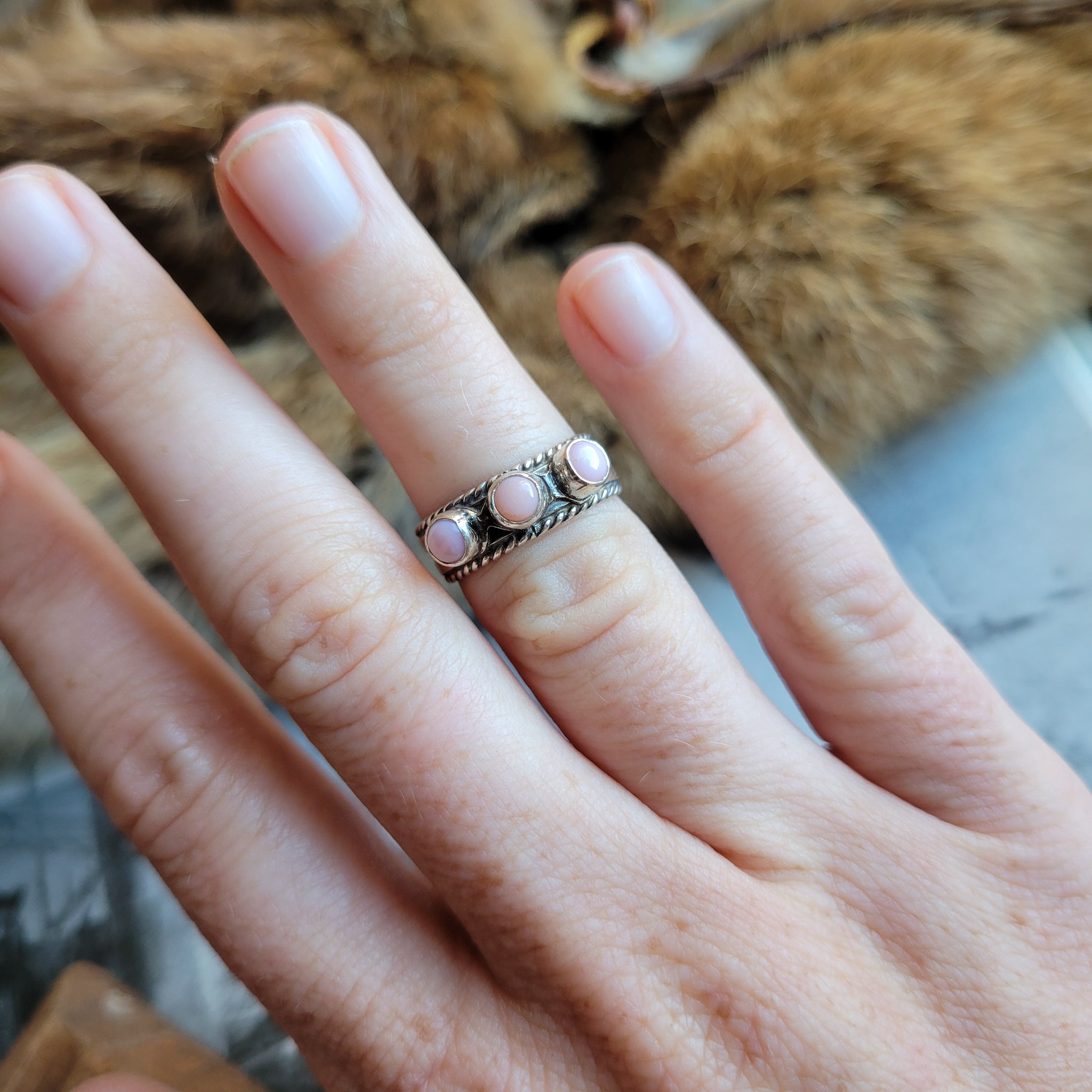 These 3 stone Pink Conch × Sterling Silver Stacker Rings are the perfect addition to your Turquoise stack!