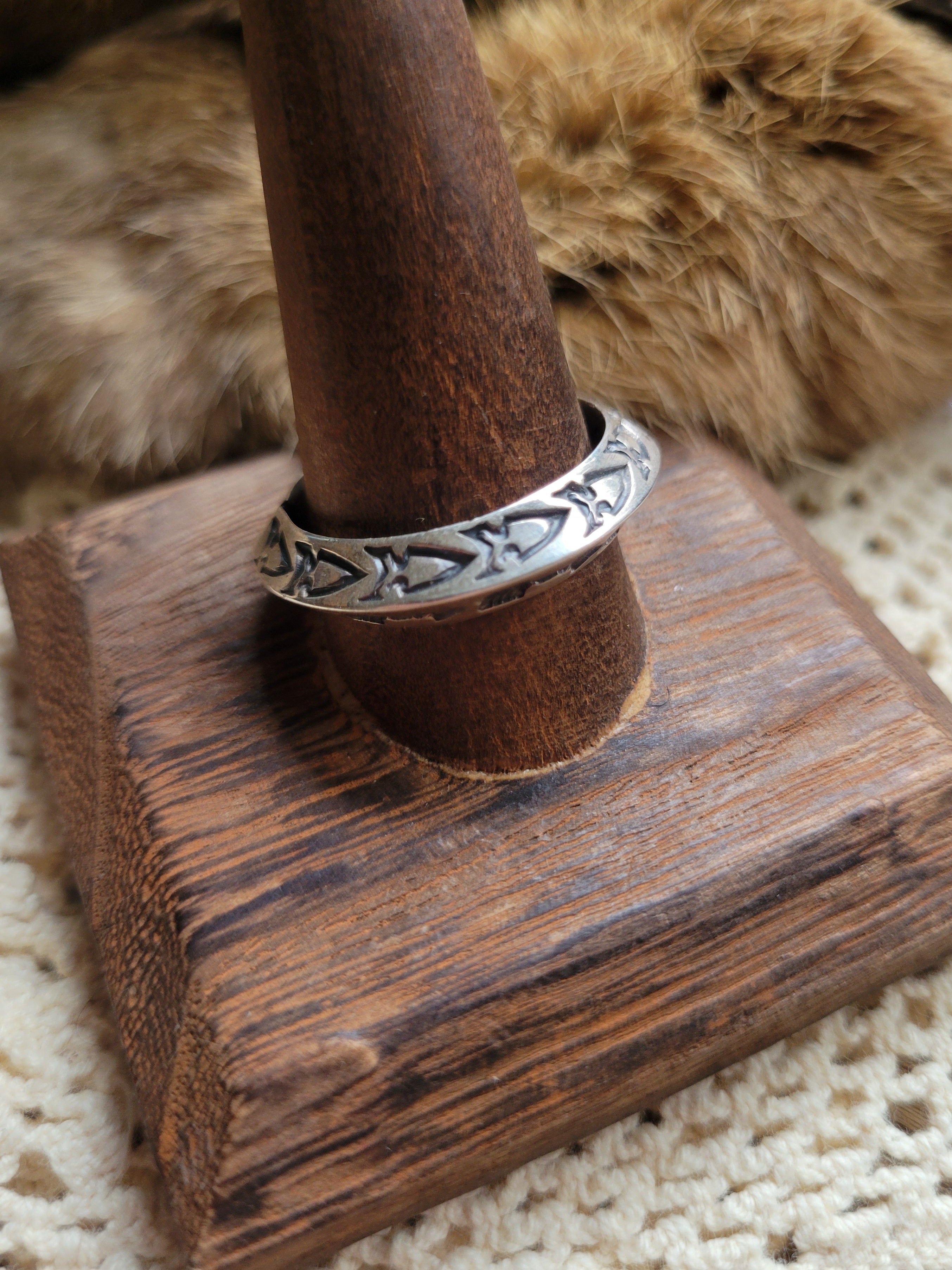 Sterling silver band featuring intricate hand-stamped arrowhead designs by renowned Native American artist Sunshine Reeves. Each piece showcases his signature detailed stamp work, creating a striking southwestern pattern across the band. Signed by the artist. Size 13. A timeless statement piece that celebrates traditional craftsmanship and artistic excellence.