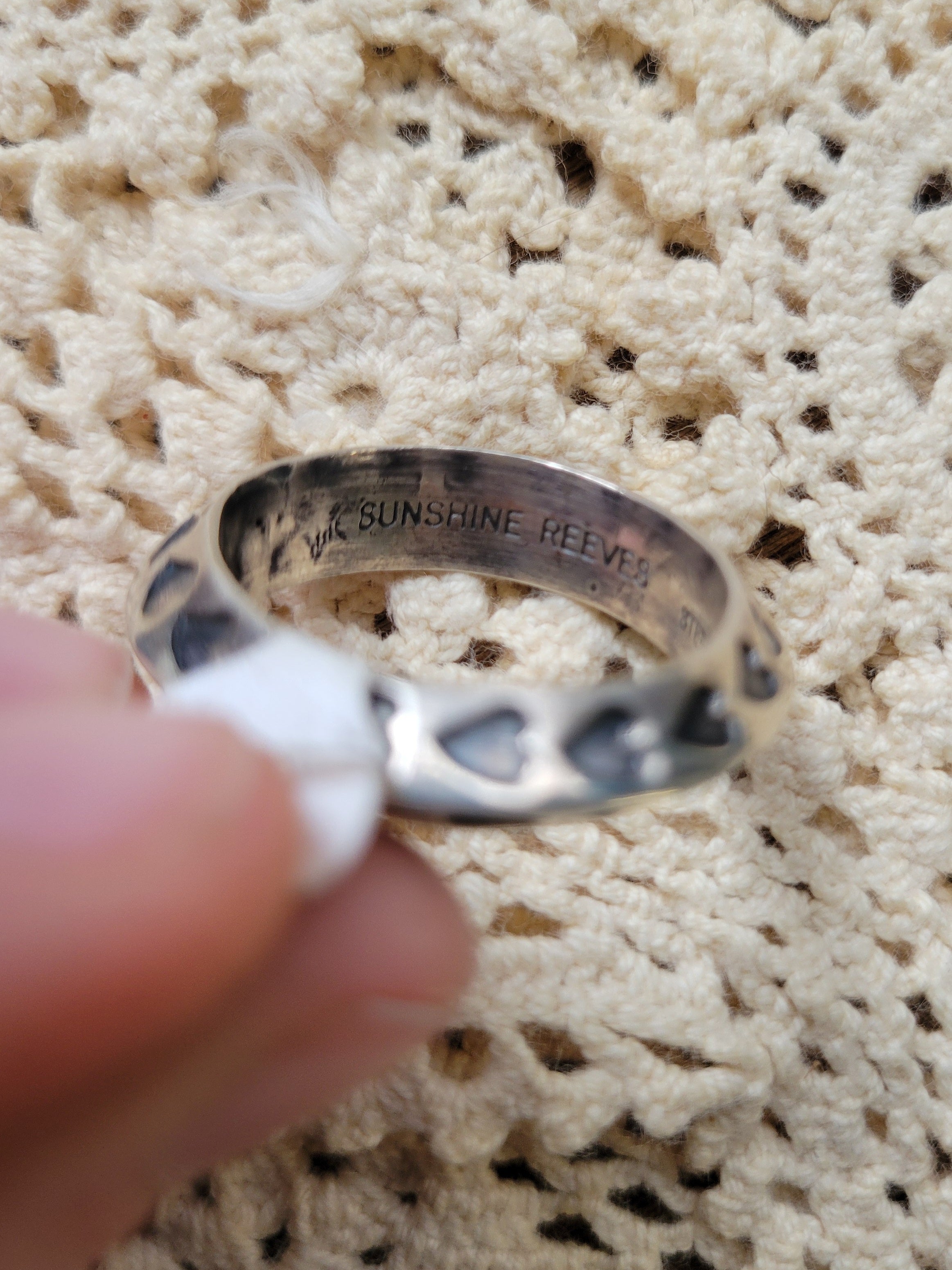Sterling silver band featuring intricate hand-stamped arrow & heart designs by renowned Native American artist Sunshine Reeves. Each piece showcases his signature detailed stamp work, creating a fun southwestern pattern across the band. Signed by the artist. Size 12.5. A timeless statement piece that celebrates traditional craftsmanship and artistic excellence.