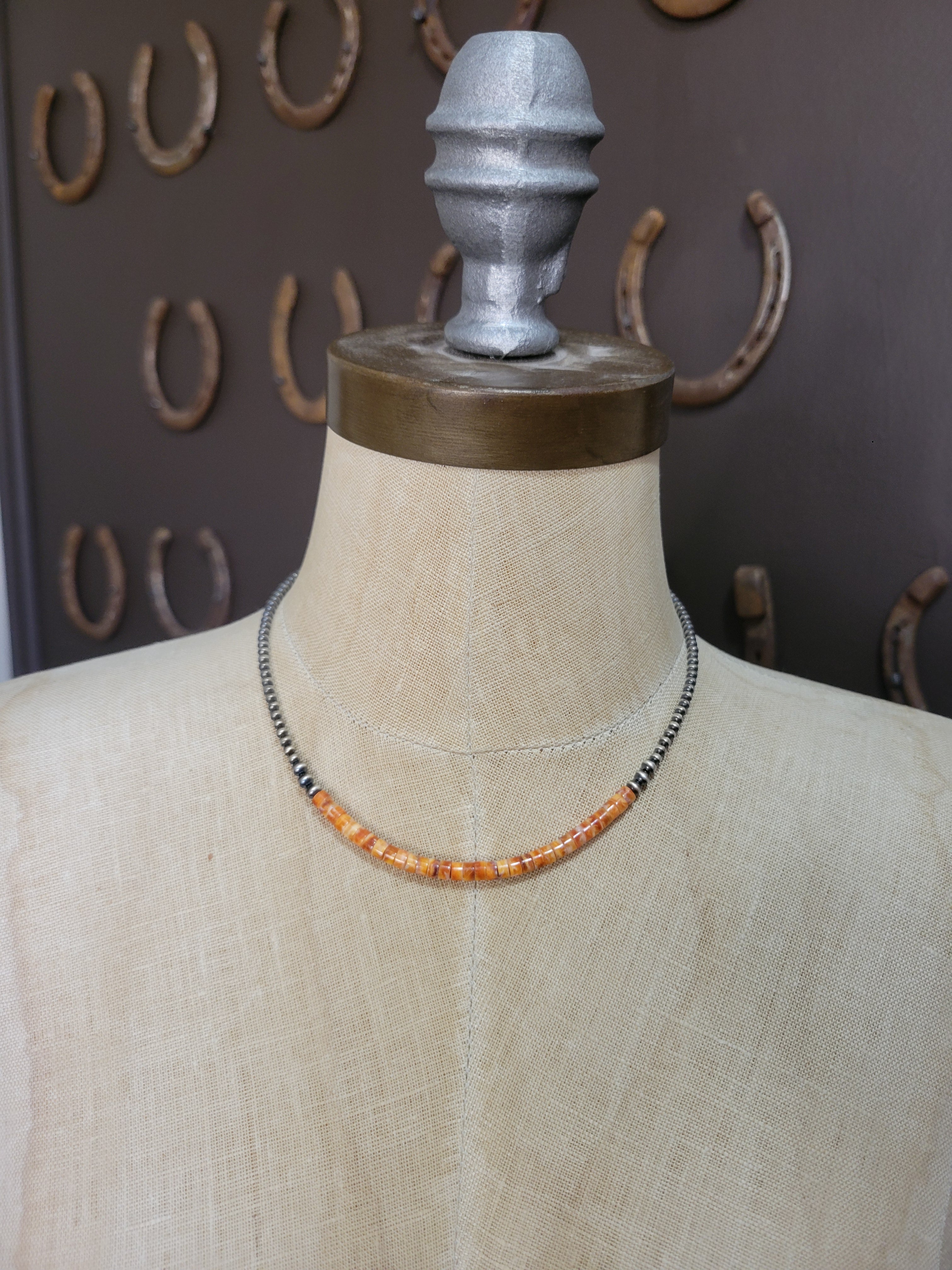 Striking orange spiny oyster shell heishi beads take center stage in this daily size necklace that tends to make a statement, completed by delicate 3 and 4mm sterling silver pearls that line both sides. The warm, natural tones of the spiny oyster create an eye-catching focal point, while the polished silver accents add sophistication and shine. Adjustable 16-inch length with a 2-inch extender ensures a perfect fit for any occasion. A versatile piece that bridges bohemian charm with refined elegance.